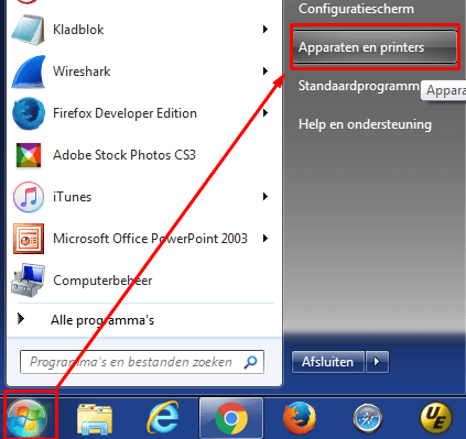 Klik in Windows op de Start-knop en ga naar 'Apparaten en printers':