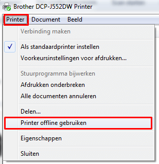 Als in de titel (naast de naam van printer) staat dat de printer offline is, klik dan in het menu op Printer en vervolgens op 'Printer offline gebruiken':