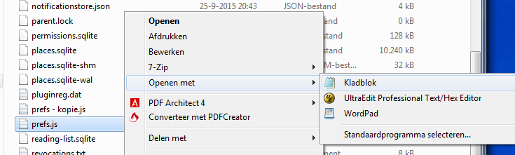 Als het bestand is gekopieerd staan er 2 (de net gekopieerde heet standaard 'prefs - kopie.js'). Klik met de rechtermuistoets op het originele bestand prefs.js en kies uit het systeemmenu 'Openen met' en vervolgens Kladblok.