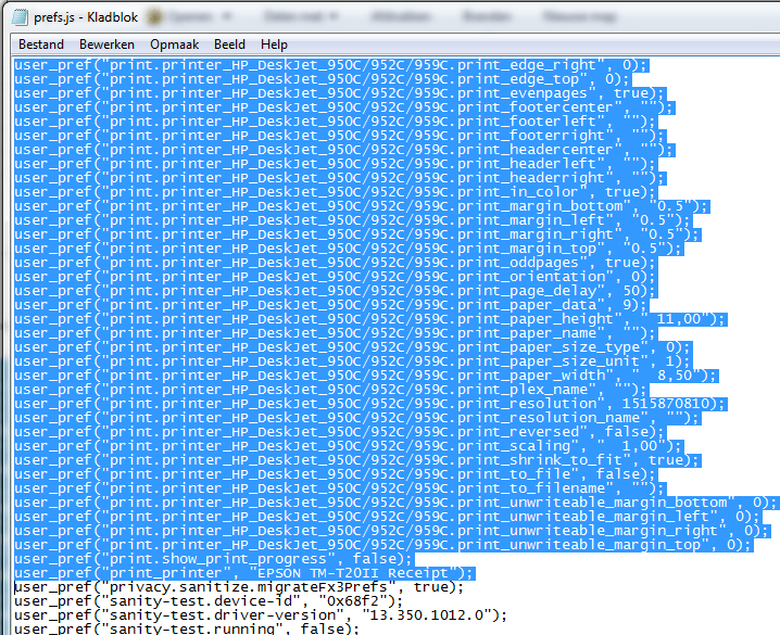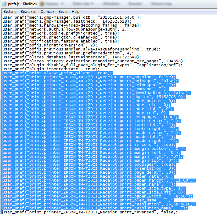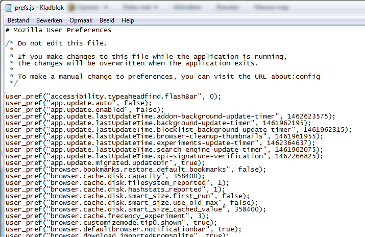 Als Kladblok is gekozen start het programma Kladblok op en kan de inhoud van het bestand prefs.js worden bewerkt.